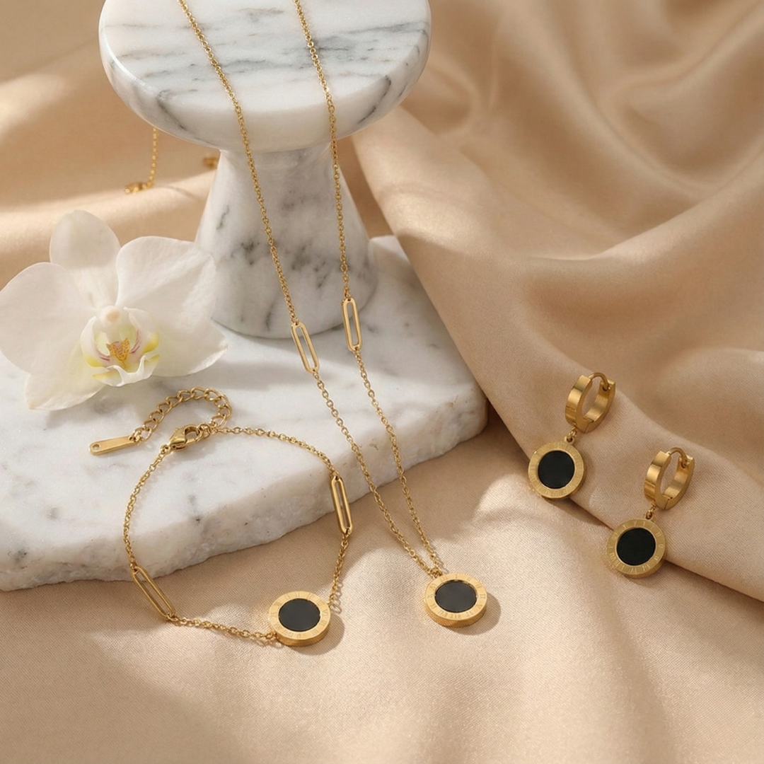 El Conjunto de Lujo en Acero Inoxidable con números romanos combina diseño clásico y acabado moderno para quienes entienden que los detalles marcan la diferencia.